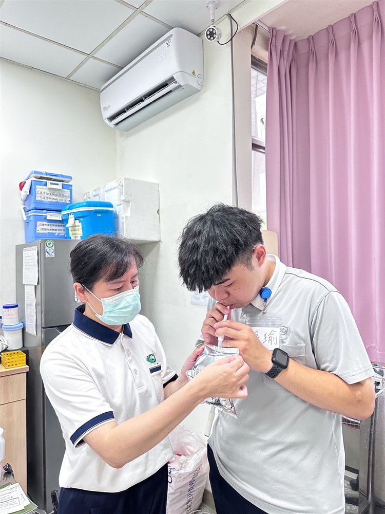 彭小芳老師 ( 左 ) 在帶學生走入社區實習之前先演練一些 基本技術。圖為學生實際操作碳13 呼氣法,檢測胃幽門螺旋桿菌。