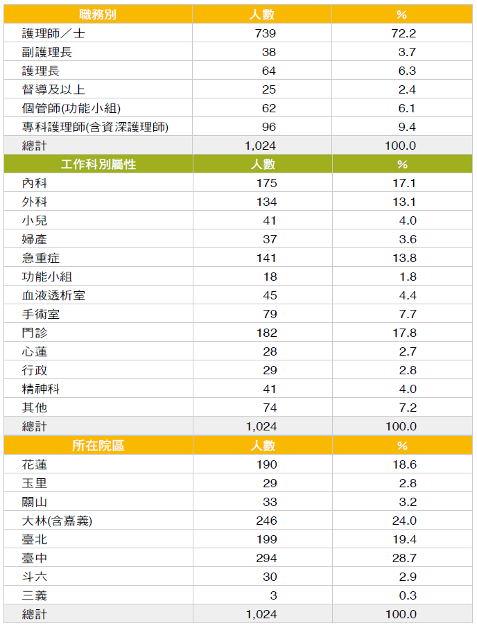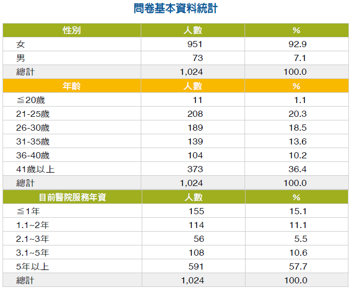 電子問卷發送八家慈濟醫院護理人員,有效問卷1,024 份。問卷第一題請問半年內曾使用的輔助性療癒方法, 超過兩成的有音樂療法(25.2%)、芳香療法(20.6%),其次是穴位按摩(14.5%)、正念療法(11.2%)等,列出的選項都有人選擇,選「其他」的答案則有冥想、仿真嬰兒、頻譜儀燈等。