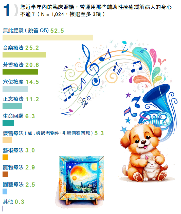 不過,有超過一半的臨床護理人員(52.5%)未曾在臨床使用輔助療法,或許是臨床常規照護就足夠、忙不過來,或是單位特性較不需要或不適合,也或許是護理人員還沒有接觸輔助療法的相關課程,還不會運用等等各種原因。