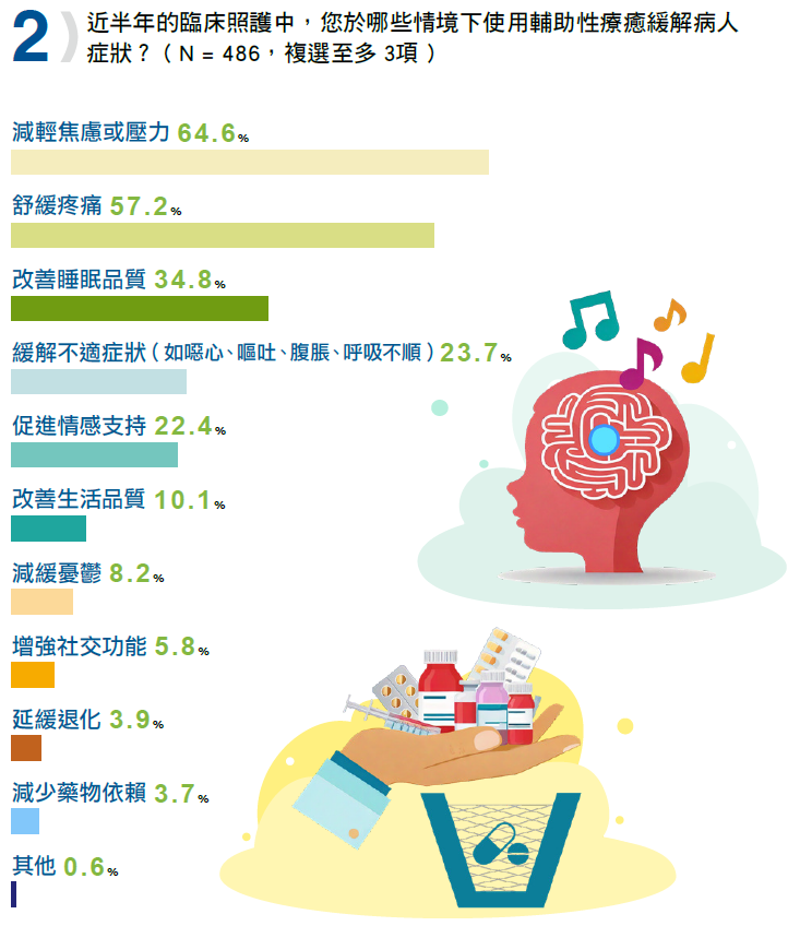 回答比例最高的選項是減輕焦慮或壓力(64.6%)、舒緩疼痛(57.2%),排名第三為改善睡眠品質(34.8%),緩解不適症狀(如噁心、嘔吐、腹脹、呼吸不順)(23.7%)與促進情感支持(22.4%),則分別排名第四與第五,說明護理人員不僅關注病人的生理不適,也重視其情感需求,例如,在癌症病房或安寧照護,病人可能因化療或疾病進程產生噁心、嘔吐等不適,護理人員可以透過各種輔助療法來減輕症狀。