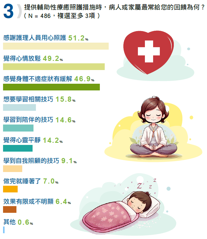 「感恩的心,讓世界更美好。」原來護理人員在提供輔助性療癒照護措施時,病人或家屬最常給的回饋是「感謝護理人員用心照護」(51.2%),顯示病人與家屬對護理人員的用心關懷與努力抱持高度感激之情。而輔助療法對於病人的實質幫助,最主要有「覺得心情放鬆」(49.2%)、「感覺身體不適症狀有緩解」(46.9%),其他如「覺得心靈平靜」、「做完就睡著了」也有一定的比例。
