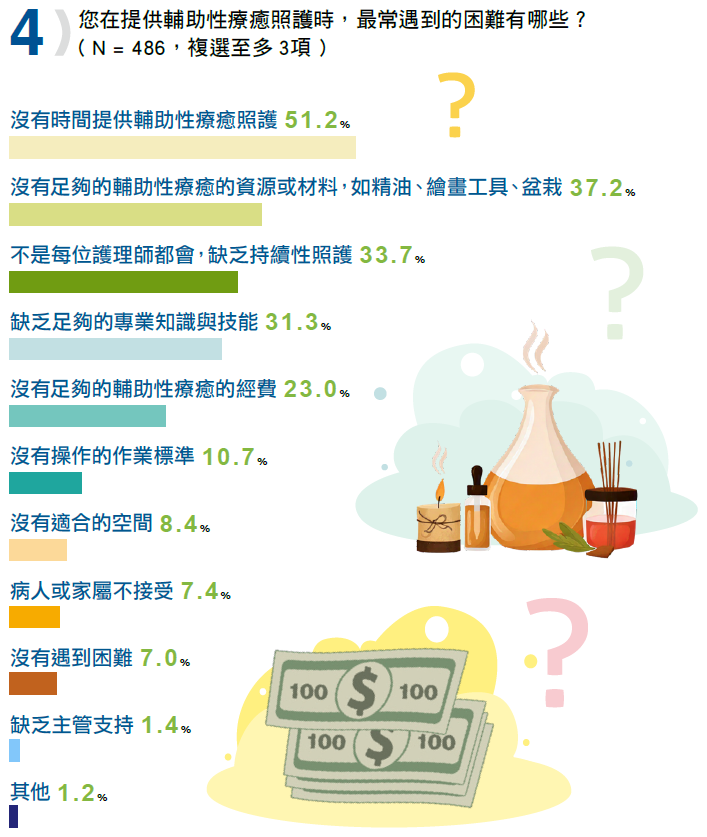 其他問題如「沒有作業標準」(10.7%)、「沒有適合的空間」(8.4%) 及「病人或家屬不接受」(7.4%)雖然比例較低,但仍需關注,特別是標準作業流程的建立,以提升執行輔助療法的規範性與一致性,也讓護理人員在執行上有所依據。選擇「其他」的回答,有人填下──臨床忙碌、部分醫師手術時不能聽音樂、個案身體不適無法配合、急慢性病房有限制,個案病況符合當科醫療的同意,有人則覺得要自己花時間去學習課程,也有人說在護理過程做輔助療法,不會有額外的酬賞機制……