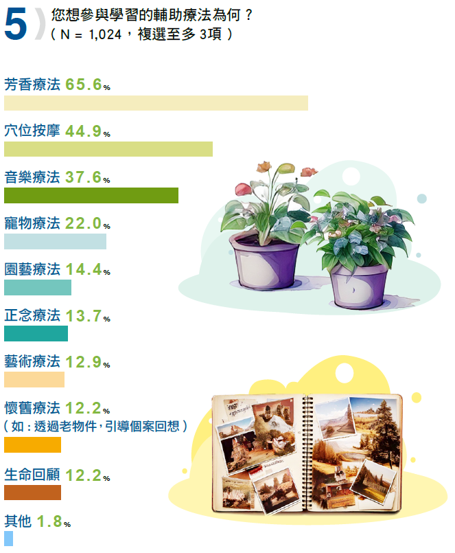 音樂療法(37.6%)位居第三,或許大家一聽覺得這應該不用上課,音樂大家都懂,音樂一放就對了,但其實有它的專業性存在,音樂播放的對象、選曲的年代感、聲量的大小、音頻等等,哪一類音樂助眠,哪一類可以安定心緒……還是要上課受過基本訓練,才不會弄巧成拙。