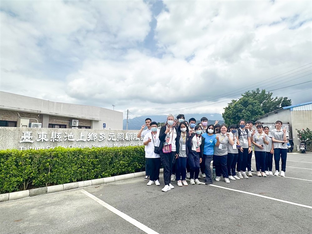 高夏子老師(左三)帶學生到臺東池上多元照顧服務中心實習。穿亮藍運動衫為關山慈濟醫院長照室古花妹主任。