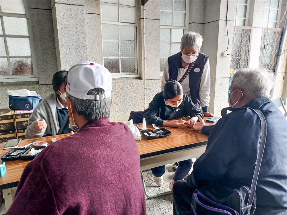 高夏子老師帶著學生照護社區長者,圖為為長者修剪指甲。