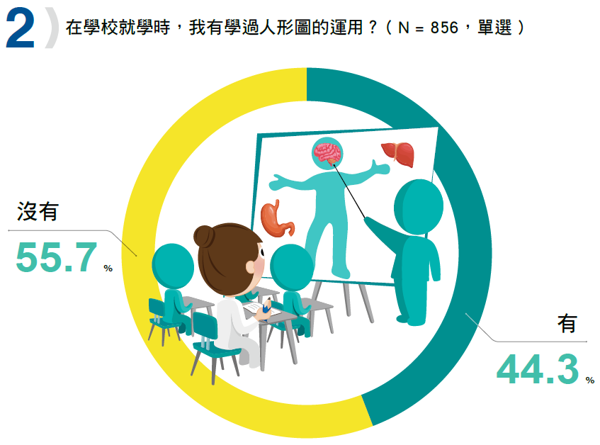 本期共有1,126 人填寫問卷,76.0% ( n = 856 ) 知道護理部在推動人形圖案例報告及教學,相對有24.0% 不知道。知道的人之中,在學校就已經學過的占了44.3%,等於超過四成在學校就接觸過人形圖,顯示圖像式教學對於教師及學生,都有很高的接受度。
