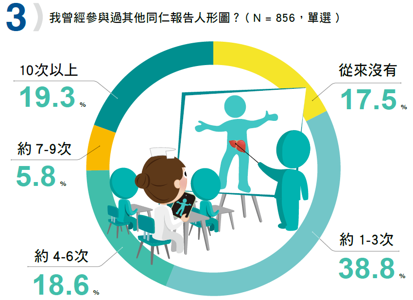 知道人形圖的人之中,沒有參加過人形圖教學或個案報告的有17.5% (n=150), 參與過1-3 次報告的人最多, 占38.8%, 其次是10 次以上者有19.3%,參與4-6 次的也有18.6%,7-9 次的有5.8%。在花蓮慈院的人形圖個案報告教學通常都安排在中午1:30 以後,除了護理主管之外,護理長也會邀請其他職類的人員、當班護理師、和實習學生和老師一起參與討論。因此如果長期固定夜班的護理師,參與的機會就會比較少。