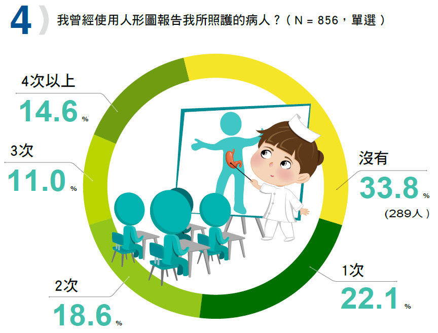 不曾自己實際運用人形圖報告的有8%,而在近七成有報告經驗的人之中,以1 次最多,占22.1%, 2 次的18.6%,報告過3 次的11.0%,報告過4 次的有14.6%。在開始推動人形圖初期,沒有特別規定的人員報告,大約每1-2 個月,每個單位會有一次報告,報告人員會由護理長指派。後來為了鼓勵更多人參與,開始開放人形圖報告可以做為案例分析的報告,讓人形圖報告通過的證明,可以當作是晉升N2 案例分析的佐證資料。