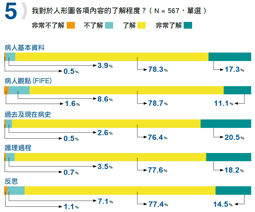 調查發現大家對於過去病史和現在病史的內容最了解, 有20.5% 表示非常了解,76.4% 表示了解。對於護理過程和基本資料非常了解的也有18.2% 及 17.3%,非常了解反思和病人觀點(FIFE) 的比例占比較低,分別是14.5% 及11.1%。這個結果和下一題問到他們覺得在運用人形圖的過程,感到比較困難的項目,也是反思和病人觀點(FIFE) 比率較高,分別是32.4% 及43.1%。