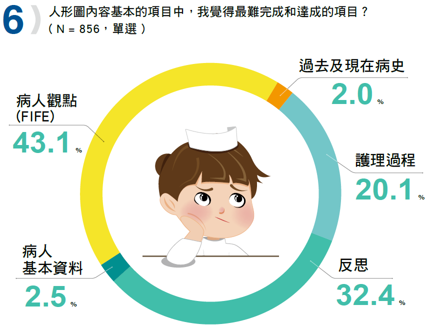 比較驚訝的是, 有20.1% 表示護理過程的達成是困難的。護理過程是所有護理師在學校就開始學習的重要護理技能,護理師每天都運用護理過程提供病人照護。讓護理人員覺得護理過程是困難的原因,可能是現在的紀錄都是使用套裝式的軟體讓自己勾選,是很直覺式的反應病人的健康問題和措施,當要將這些內容整理歸納,需要運用邏輯性思考判斷,所以感到困難。我們在護理師完成整幅人形圖之前,會請護理師在個案報告的最上方列出一個主題,就是在訓練護理師重整歸納的能力,歸納出這個人形圖案例報告的重點。