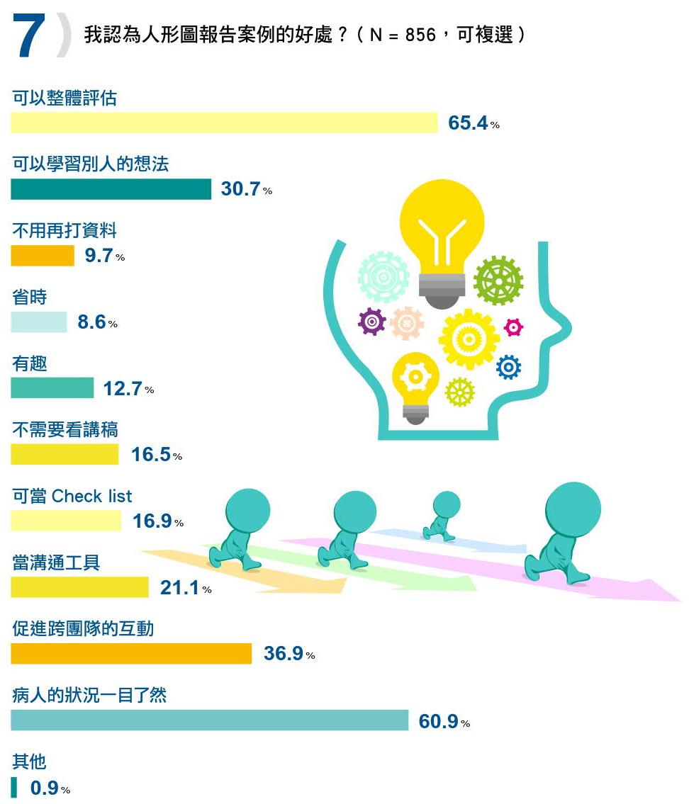 人形圖報告案例的好處有那些?最多人認為的好處是可以整體評估,有65.4%,其次是病人的狀況一目了然,占60.9%,這二項也是當初人形圖教學的目的。