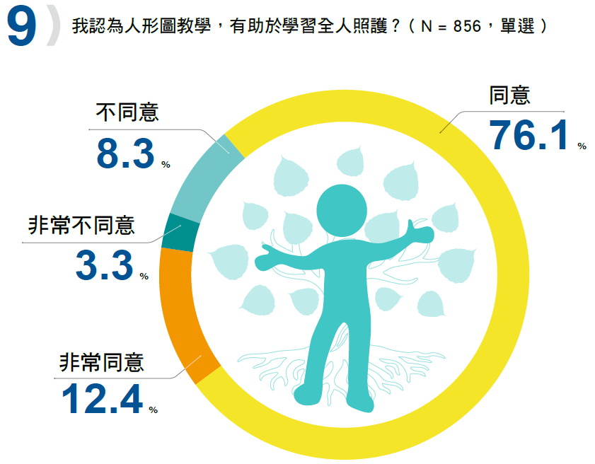 人形圖教學,是否有助於學習全人照護?僅有11.6% 不同意。有12.4% 表示非常同意,有76.1% 表示同意。全人照護包含生理、心理、社會、和靈性的照護, 一張小小的90*60 的海報要呈現全部確實不容易,但也因為在同一張海報呈現,更容易看出彼此的相關性,有時可能是生理的症狀影響病人心理的感受,例如癌症病人因化學治療造成的噁心嘔吐,可能會帶來下一次化學治療的恐懼,或是親人因癌離世影響病人接受治療的選擇等,這些病人的關鍵人物或是成長的重大事件都會影響到病人的照護,也因此全人照護是醫學教育和醫院的教學目標。其實人形圖教學中還有一項重點,就是護理師與病人之間的護病關係,我們特別強調護理師如何稱呼他/她所照顧的病人,這是讓護理師與病人建立信任關係的第一步。