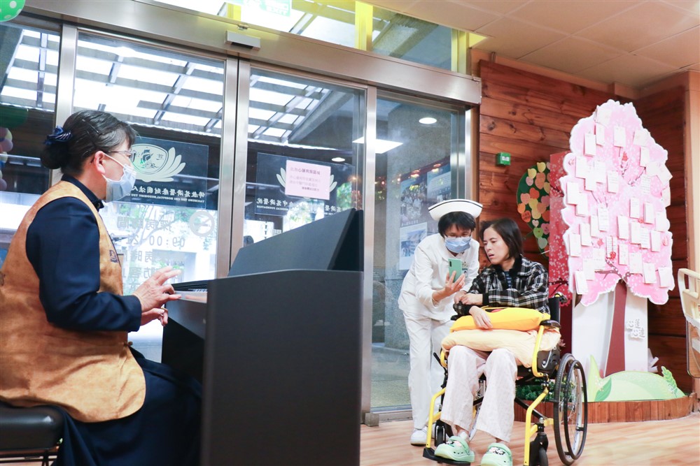 音樂不僅是日常生活的一部分,更能觸動人心,影響情緒與身心平衡。研究顯示,柔和的音樂能降低焦慮,促進前額葉皮質活化,從而減少壓力反應,提升整體舒適度。在心蓮病房,每週一下午「音樂時光」,成為病人與家屬共享的溫馨時刻。音樂志工大緯輕撫琴鍵,彈奏長輩熟悉的老歌、慈濟歌曲、古典樂章,甚至即興演奏客家歌謠。這些旋律如同情感的絲線,串聯起病人與家屬的許多連結。