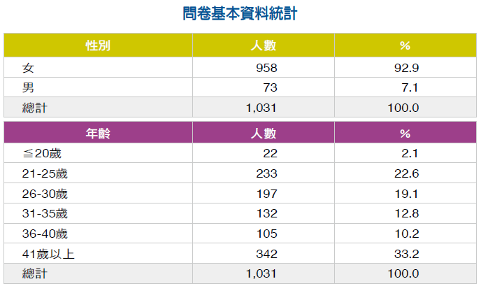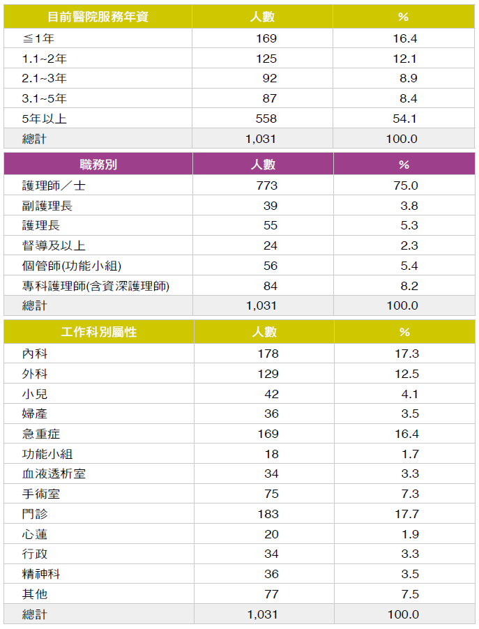 本期問卷發送至8 家慈濟醫院護理人員,回收1,031 份有效問卷,其中女性占92.9%(N = 958),男性占7.1%(N = 73)。年齡以41 歲以上(33.2%, N= 342)及21-25 歲(22.6%, N = 233)占最多。年資以5 年以上的占最多,占54.1%(N = 558)。