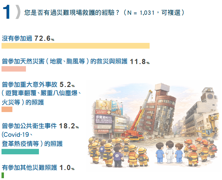 結果顯示有72.6% ( N = 748 ) 都沒有參與過災難現場救護的經驗,11.8% 護理人員曾參加天然災害(地震、颱風等)的救災與照護,18.2% 曾參加公共衛生事件(COVID-19、登革熱疫情等)的照護。