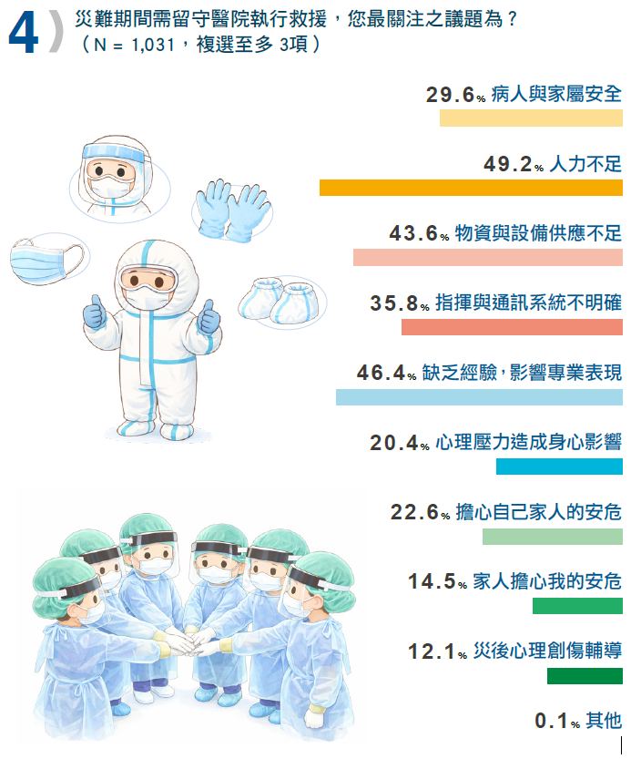 本次調查也提醒我們:災難準備,不只是制度與流程,更是知能培育、團隊合作與心理支持的整體工程。當護理人員被看見、被支持,他們就能在最危急的時刻,發揮最大的力量。願我們持續打造更安全的臨床環境,讓每一位肩負使命的護理人員,都能安心站在守護生命的第一線;因為有他們,社會在災難面前,始終有力量不被擊倒。