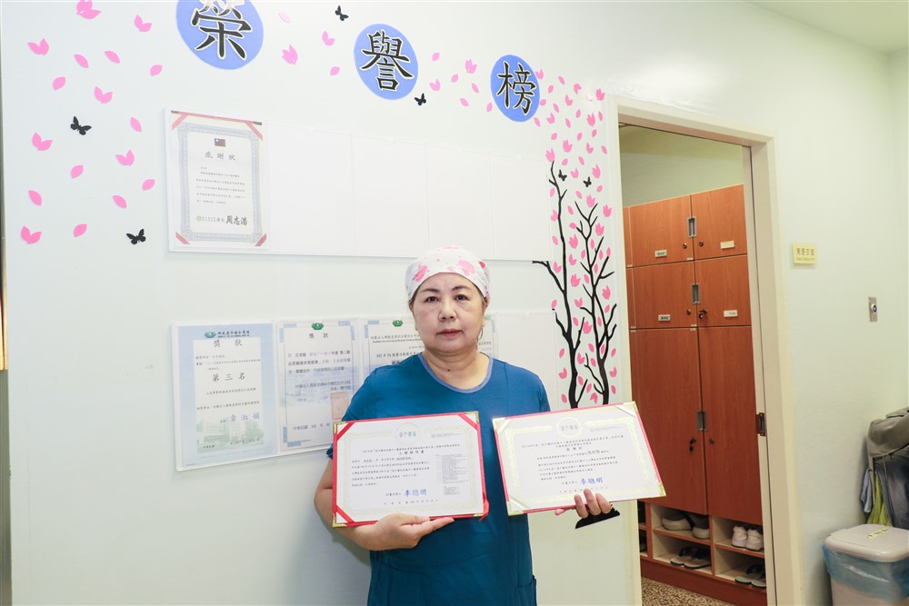 張美雪回想,台中慈院啟用前,她應徵供應中心組長,當時的護理部督導劉淑玲就告訴她,既然要當到主管,N4 就一定要寫出來,當時的她雖然完全沒有信心能達到目標,仍是硬著頭皮全力以赴,最終在前督導劉淑玲盡心輔導下,順利進階拿到N4。