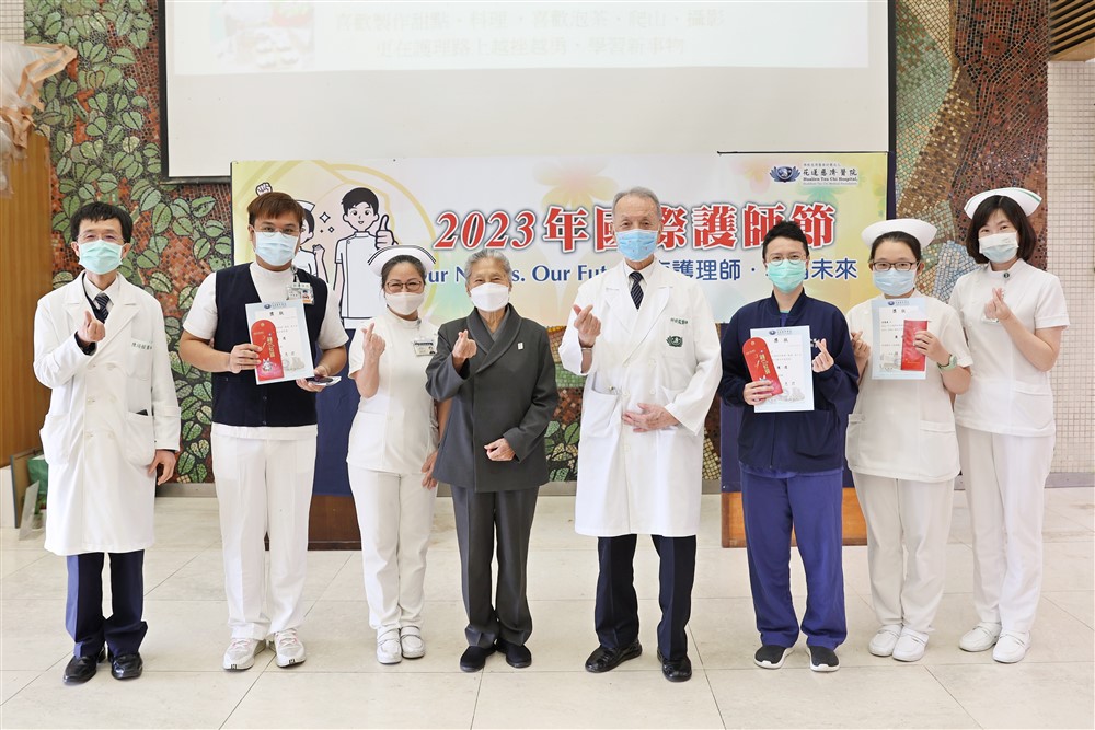 彭宣燕(右二)通過2023 年花蓮慈濟醫院護理部「護理、為人生加分」徵選,在五月十二日護理師節活動中頒獎。左起為:陳培榕副院長、二五東病房洪萬康副護理長、護理部鍾惠君主任、慈濟基金會副總執行長林靜憪、慈濟醫療法人執行長林俊龍、外科加護病房科護理師林怡岑,右一為慈濟大學護理系張美娟教授。攝影/江家瑜