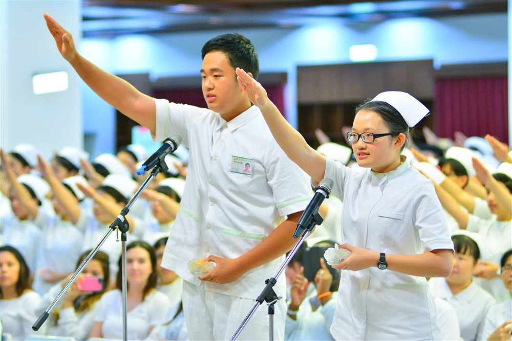 2017 年5 月12 日,慈濟科技大學護理系舉辦第26 屆加冠典禮,彭宣燕(右)擔任五專生的宣誓代表,引領同學進行加冠宣誓。左為張恭銘同學。攝影/陳李少民
