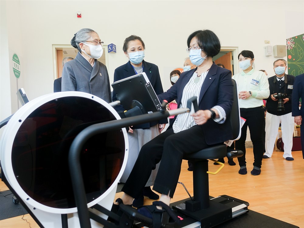 2021 年1 月25 日慈濟基金會長照推展中心於在彰化靜思堂成立日間照顧中心,有健身器材、環景的靜思茶道區、獨立的靜心室、腦力激盪的活化認知區、人際互動、專屬的園藝區等等。圖為彰化縣長王惠美(前右)在慈濟長照推展中心總召集人林碧玉副總(前左)、副召集人莊淑婷副院長(前中) 陪伴下,體驗日照中心長者的健身器材。攝影/陳誼謙