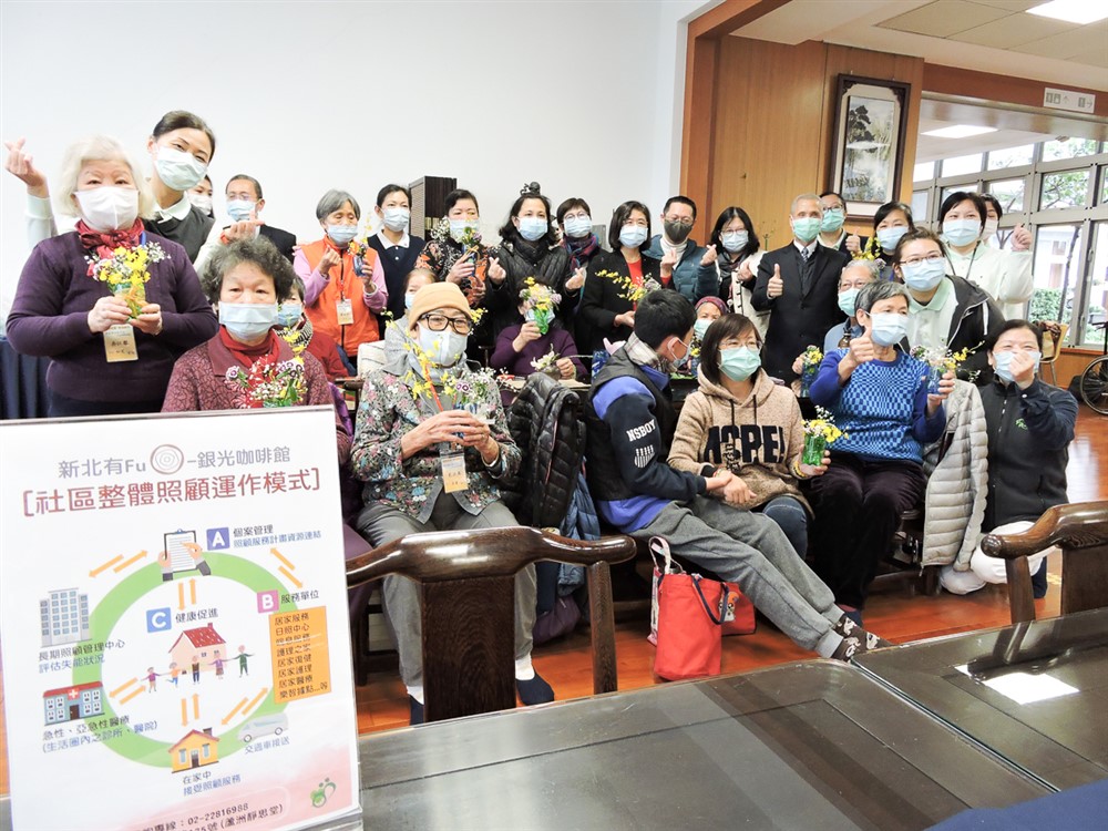 慈濟基金會配合新北市政府於蘆洲靜思堂開辦「銀光咖啡館、有FU 長照站」,2021 年1 月11 日新北市衛生局陳潤秋局長(後排中右,著紅衣黑西裝)前來關心,長照推展中心副召集人莊淑婷(後排中左)陪同介紹,局長也肯定慈濟和政府一起提升長照能量。攝影/顏