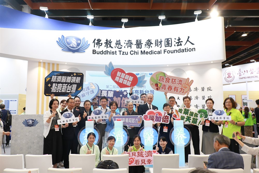 2025 年第2 屆高齡健康產業博覽會,慈濟醫療財團法人四家醫院(花蓮慈濟醫院、嘉義大林慈濟醫院、台北慈濟醫院、台中慈濟醫院) 以「慈濟醫養領航,點亮新臺灣」為主軸共同展出,衛福部長照司長祝健芳(中左二)、慈濟基金會林碧玉副總(中左)、慈濟醫療法人林俊龍執行長(中右)帶領各主管合影。攝影/賴廷翰