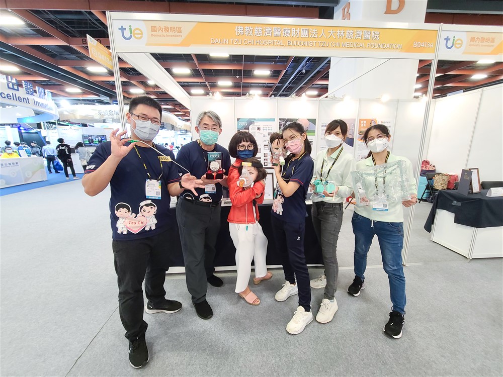 大林慈濟醫院護理用品創新研發團隊參展留影,左圖左二為林興隆督導,左三為林祝君老師,左四為卓宜鋒護理師。
