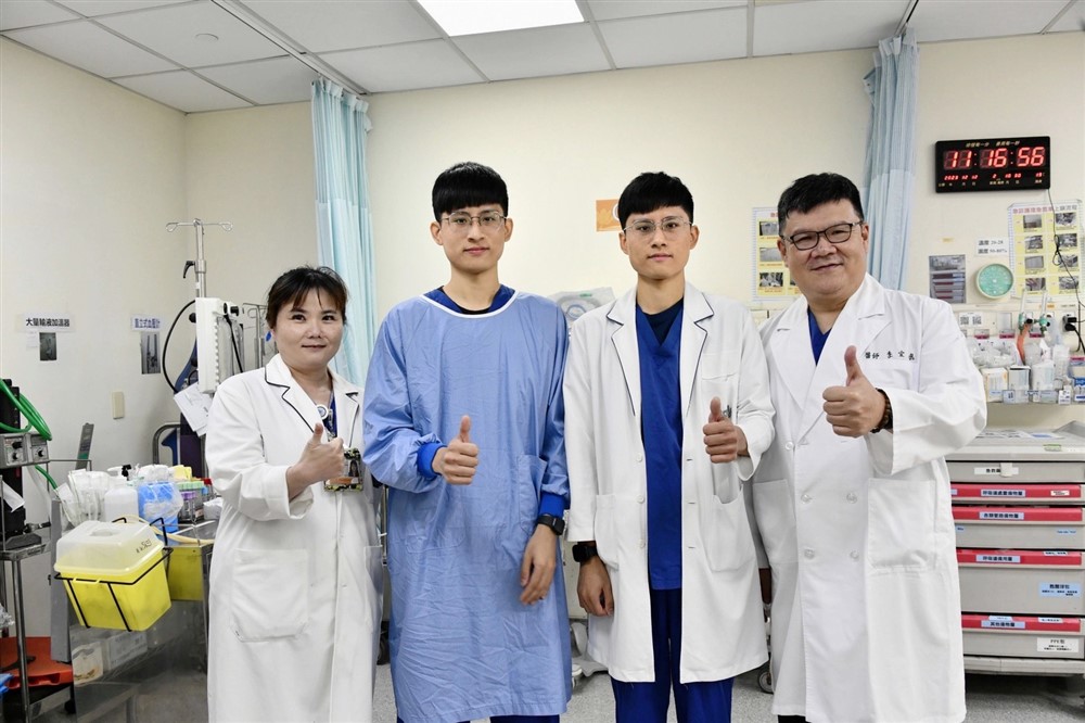 急診護理師林承睿(中左)與雙胞胎弟弟加護病房護理師林承濬(中右)在非工作時間發揮專長協助民眾急救,感謝急診主管的教導,左為急診護理長李荔芳,右為急診部李宜恭主任。攝影/黃小娟