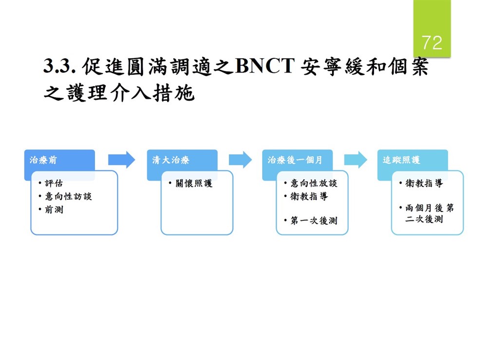我們進行範域研究,把腦瘤晚期臨床指引的內容整理出來,再用民族誌應用參與、觀察、訪談,去看個案接受硼中子捕獲治療前後經驗的主要的內涵,然後在介入措施中我們是安排意向性的溝通跟衛教。進行「單組前後測」去看它的成效。因為個案的治療很快,沒有傷害性也不需要開顱手術,他只要前一天去北榮住院,第二天一早坐救護車去清大,兩個小時左右就結束治療,再回榮總觀察一天就可以回家。因為這些對象是緩和治療的個案,在互動上,我們須了解他們心理上會經驗到預期性失落,面對生命與家庭的糾結都還在。在治療後一個月就開始做意向性訪談和衛教,我們會一直追蹤,包括治療前、在清大治療、治療後一個月、直到最終照顧,因為個案住在臺灣各地,所以我們的照顧有面對面或視訊電話的方式,做關懷和訪談。