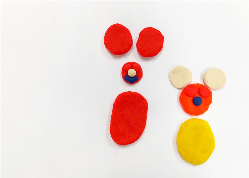 一個患有腦瘤的小朋友,小學五、六年級時病情復發,爸爸帶他來醫院檢查,我們就跟他玩黏土,問他:「你想做什麼?你要不要選個顏色?」讓他當主體,由他來選、來做,然後協助他。他先捏一隻小白兔,用紅色為主,然後眼睛、鼻子、嘴巴做完之後他就停下來,我們問:「你還想再做一個嗎?」他說好,然後又選顏色做,做完之後他說他不想做。
