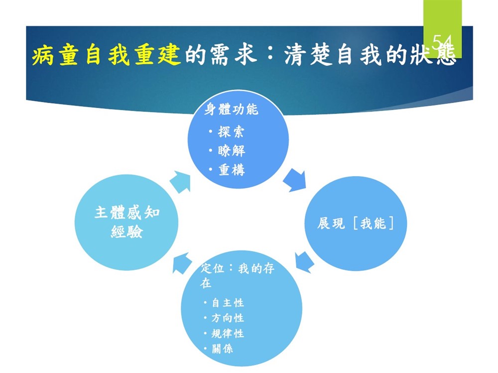 我們做了現象學訪談,其實個案在希望的歷程中有很多元的經驗。例如,他會很堅定和期待,而且希望會有驅動的認定;那他在絕望中也會反省,開始自我重設,接著會發揮他的潛能,自我超越,然後有許多人會幫助他,他會開始重返職場,重新變成(becoming)一個真正的、有尊嚴的人。