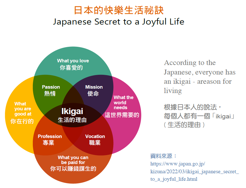 日本有一個幸福生活的理念:「Ikigai」,就是指「生活的意義」。當你找到生活的意義,就會看到活著的價值,從而覺得生活更有一股動力。同一個場合,我們也邀請到89 歲的日本樂齡人士若宮正子(Masako Wakamiya)到新加坡,分享她作為一個活躍長者的經驗。她在82 歲的時候開始創作手機程式,並受到蘋果執行長庫克的關注。她過著簡單的生活,每天做著自己喜歡的事情、分享知識,同時也把握機會學習新事物。其中之一是學習英文,因為許多海外人士都想跟她交流,為了方便交流,她開始學習英文,現在她可以用英語跟人溝通。