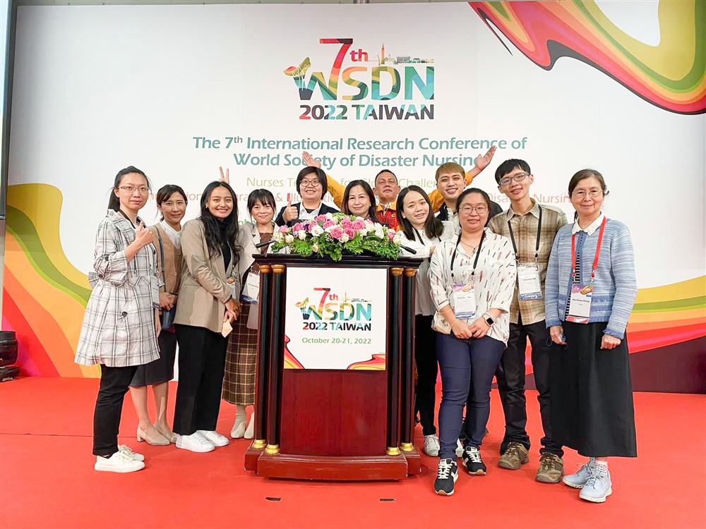 花蓮慈濟醫院護理部團隊參與2022 年第7 屆世界災難護理學會(WSDN) 國際研討會,周英芳(左五)及急診與急診後送病房同仁與會分享在災難護理上的發展成果。