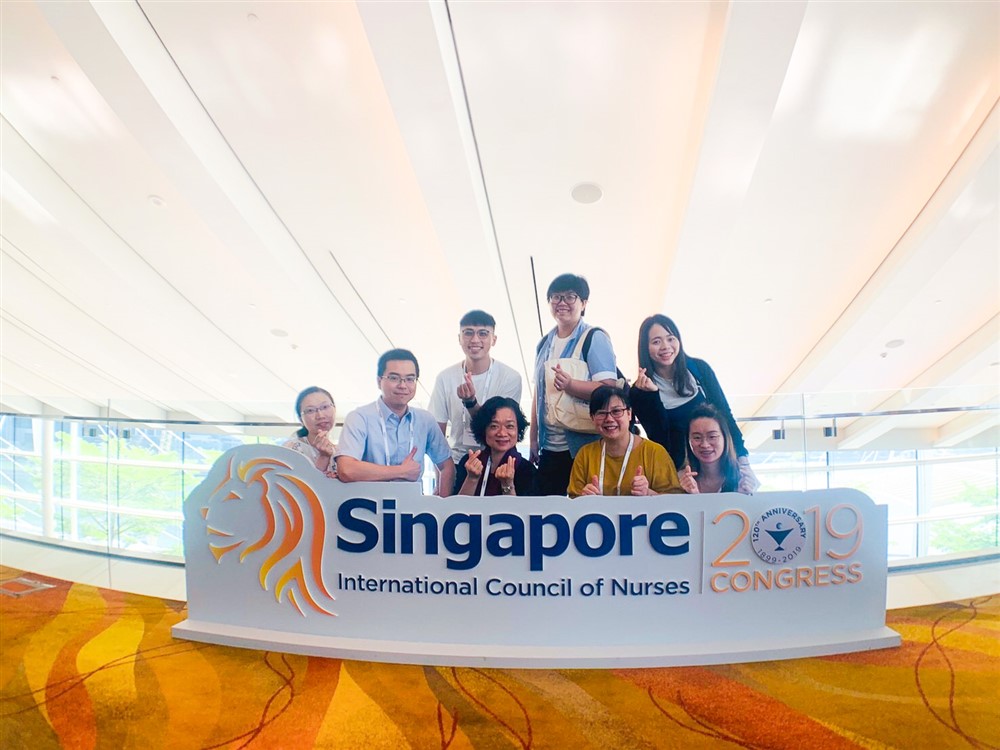 2019 年 ICN 國家代表會議暨國際護理大會在新加坡舉行,謝美玲老師(前排中)帶著學生周英芳及急診護理團隊參加投稿及發表。