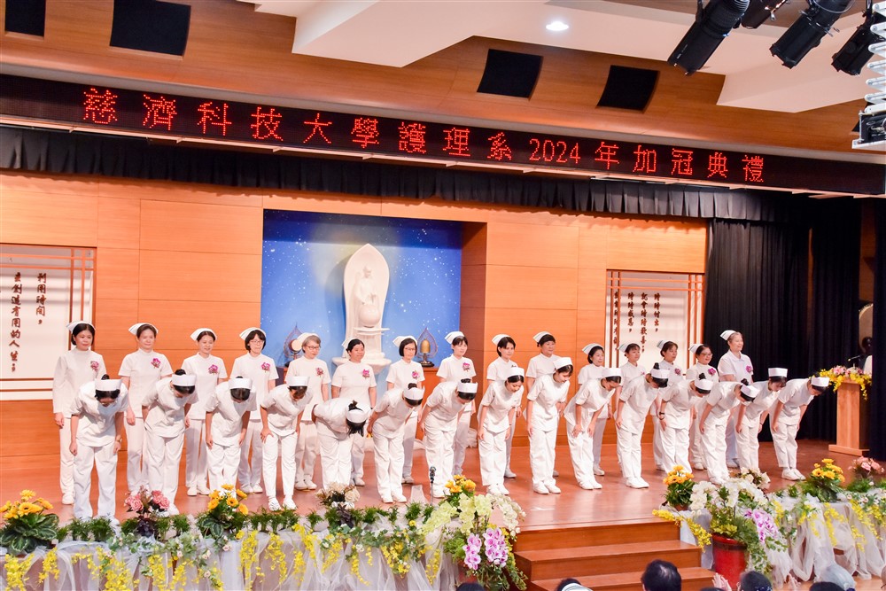 國際護師節前夕,五月十日,慈濟科技大學舉辦第33 屆加冠典禮,共317 位護理科系學生(四技86 人、五專231 人)齊聲宣誓,從六月起,學生將陸續前往醫院實習,應用所學在臨床第一線體現護理價值。