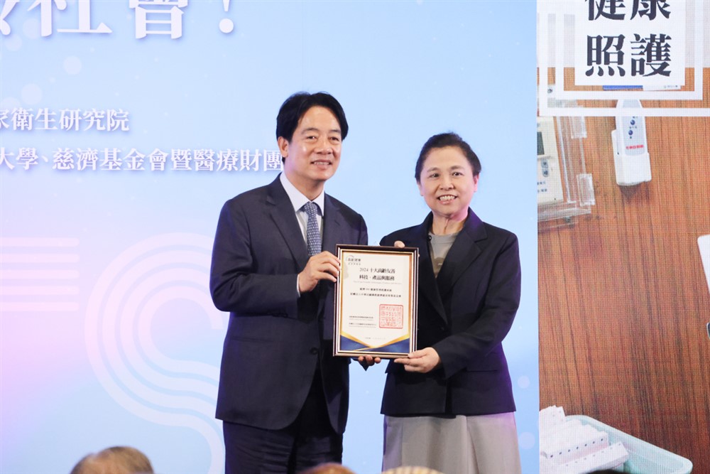 2024 年第1 屆高齡健康產業博覽會,慈濟長照推展中心自行研發的880 健康管理照護系統,榮獲全臺十大高齡特色友善科技產品殊榮,總統賴清德(左)自頒獎給慈濟長照中心副召集人莊淑婷(右)。圖/慈濟長照推展中心